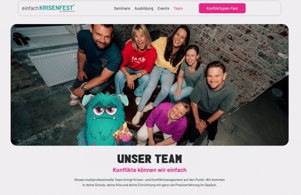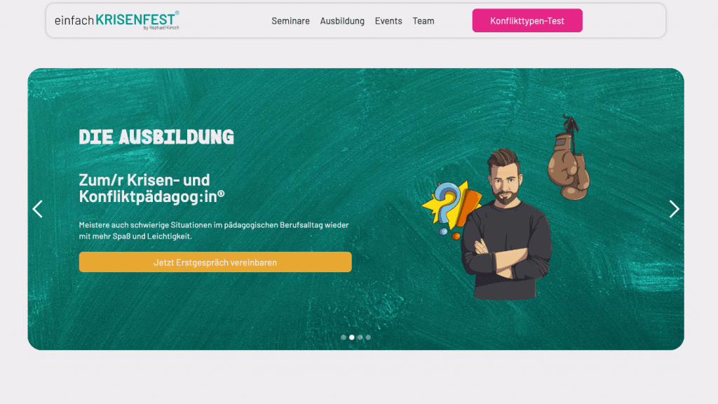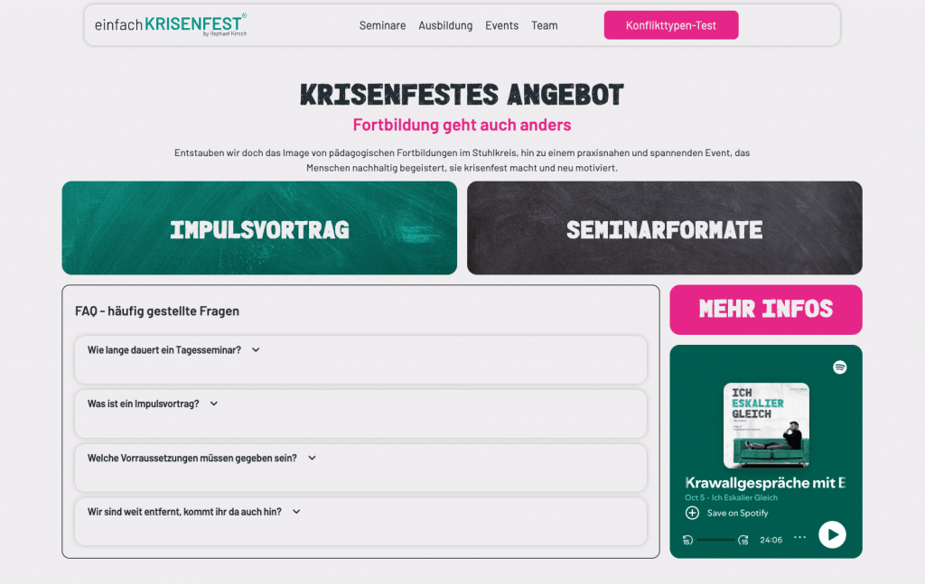 Die Website liefert ab. Technisch, optisch, emotional. Sein Team und er sind Happy. Raphael Kirsch ist so den Weg von der Personal Brand zur Brand gegangen. einfachKrisenfest ist jetzt im Web genauso Stark und Standhaft wie seine Teilnehmerinnen an den Coachings, Seminaren & der Ausbildung.