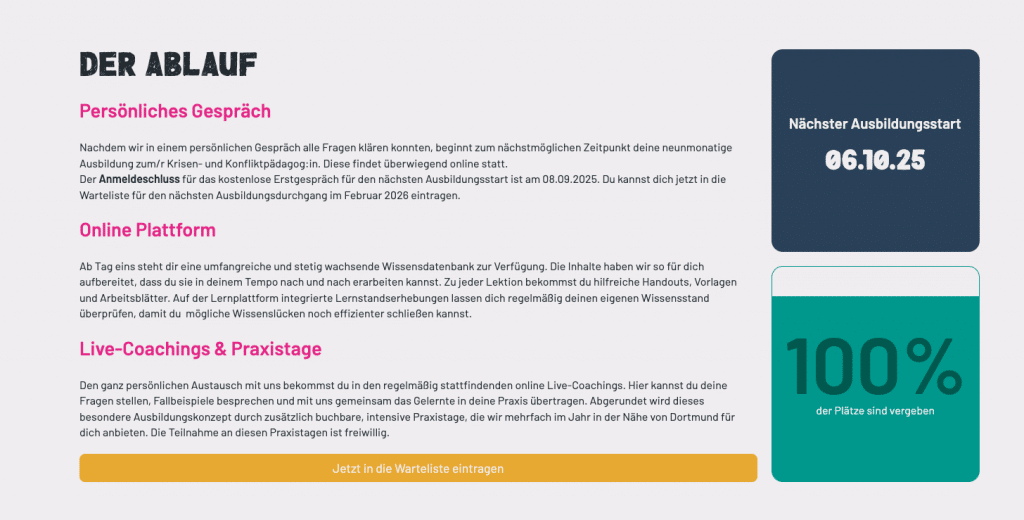 Für Seminare, Ausbildung und Events entstanden eigene Bereiche mit klarem Aufbau, klarer Sprache und leicht pflegbaren Modulen.